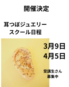 - 3月・4月 耳つぼジュエリースクール開催日2026年 3月、4月に開催される 耳つぼジュエリースク… 続きを読む: 3月・4月 耳つぼジュエリースクール開催日